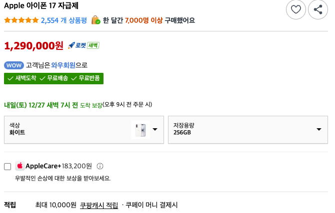 - 혜택: 쿠팡캐시 1만 원 적립