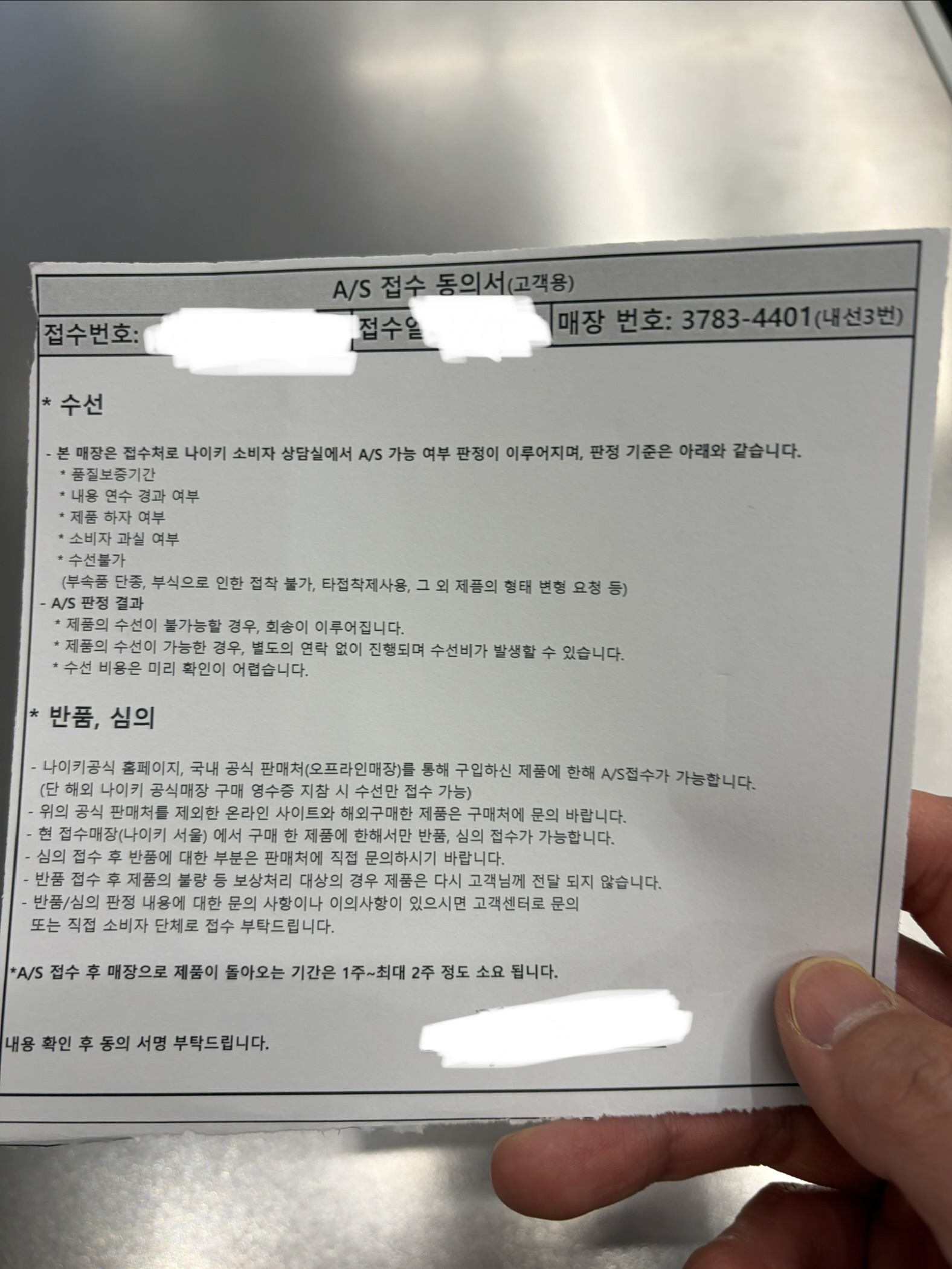 저는 가까운 나이키 서울(명동) 매장에 직접 방문하여 AS 심의를 접수하고 왔습니다.